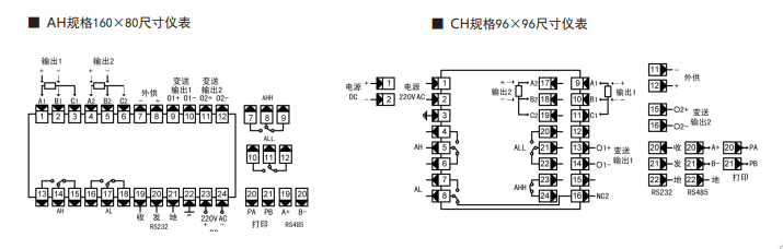 4:報警:最多4點報警輸出,可設置為2個通道測量值或運算值的上、下限。